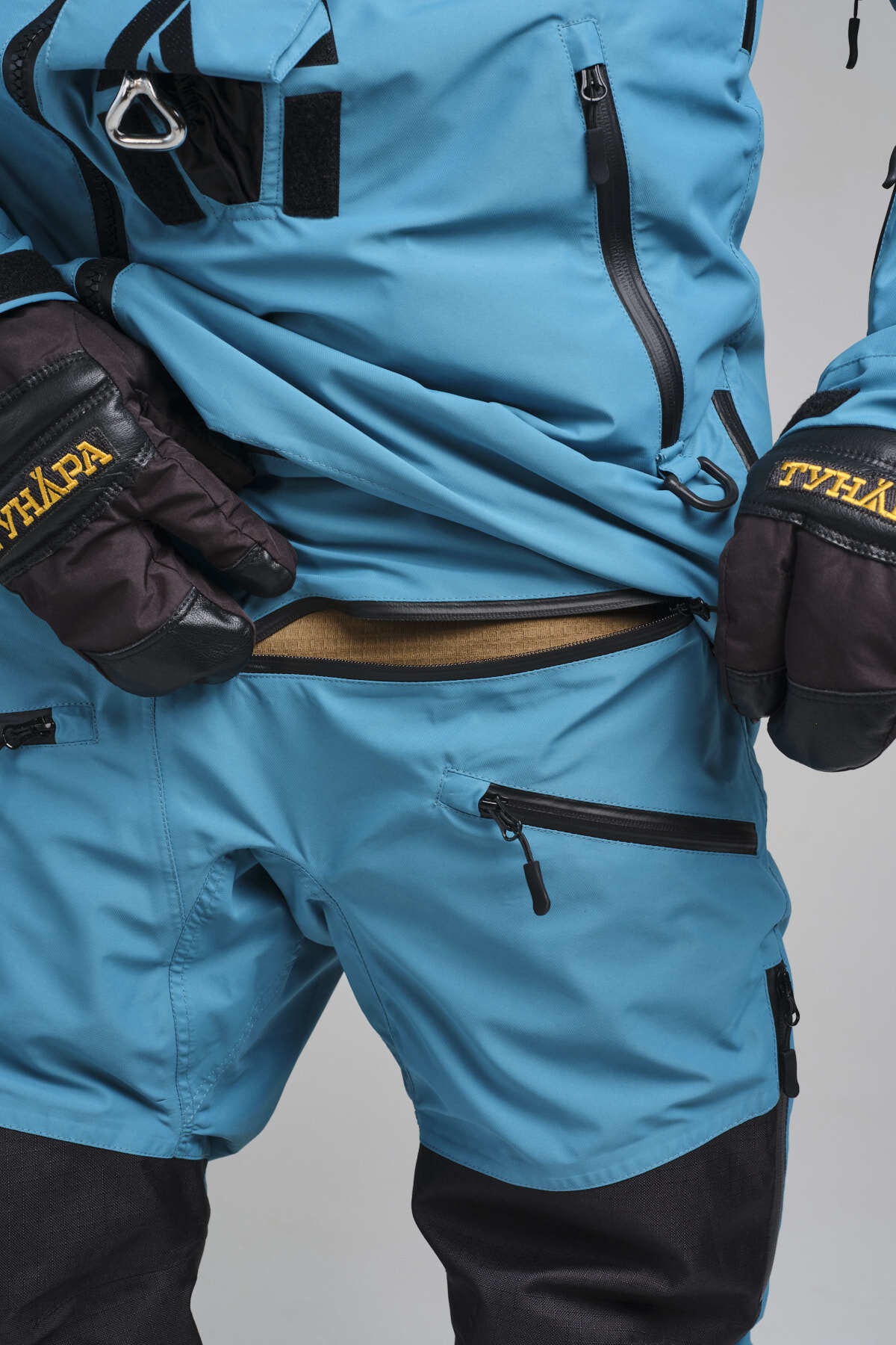 Прочность комбинезонов достигается также за счёт WR отделки и усилений в виде кордуры в зонах максимального износа — область коленей и низ штанин.