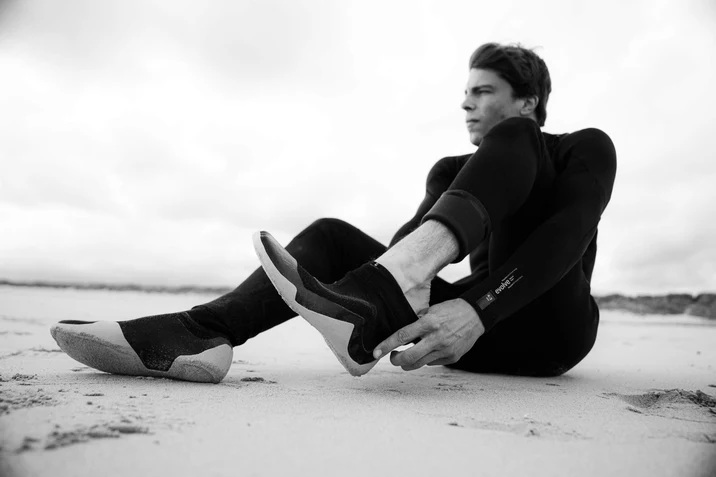 Ультратонкая подошва песочного цвета гарантирует надёжное сцепление с поверхностью, создавая эффект ходьбы босиком. Бесшовный вход без застёжек обеспечивает комфортное надевание. В области щиколотки технология Grip Print надёжно фиксирует гидрокостюм, предотвращая его смещение.