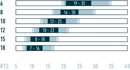 *Таблица диапазонов ветра предназначена для ориентира. Она рассчитана на райдера весом около 75 кг. Фактическое использование зависит от вашего веса, уровня подготовки, размера/типа доски (твинтип или гидрофойл) и ветровых условий на воде или на суше. Выбирая размер кайта, всегда руководствуйтесь здравым смыслом и, если вы не уверены, выбирайте меньший размер, особенно при использовании кайта на суше.